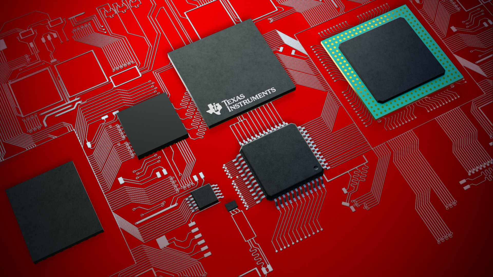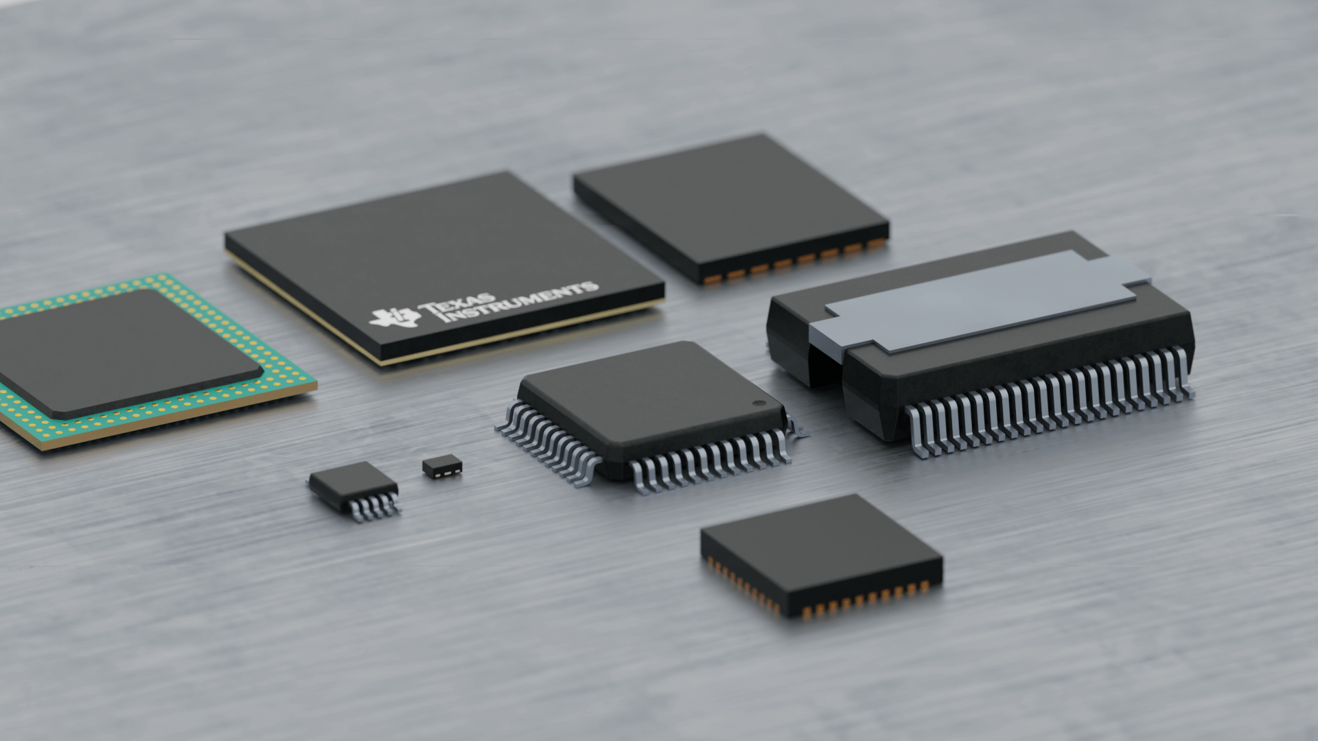 Showcase TI chip diversity (packages, sizes, pin configurations) in clean, technical style.